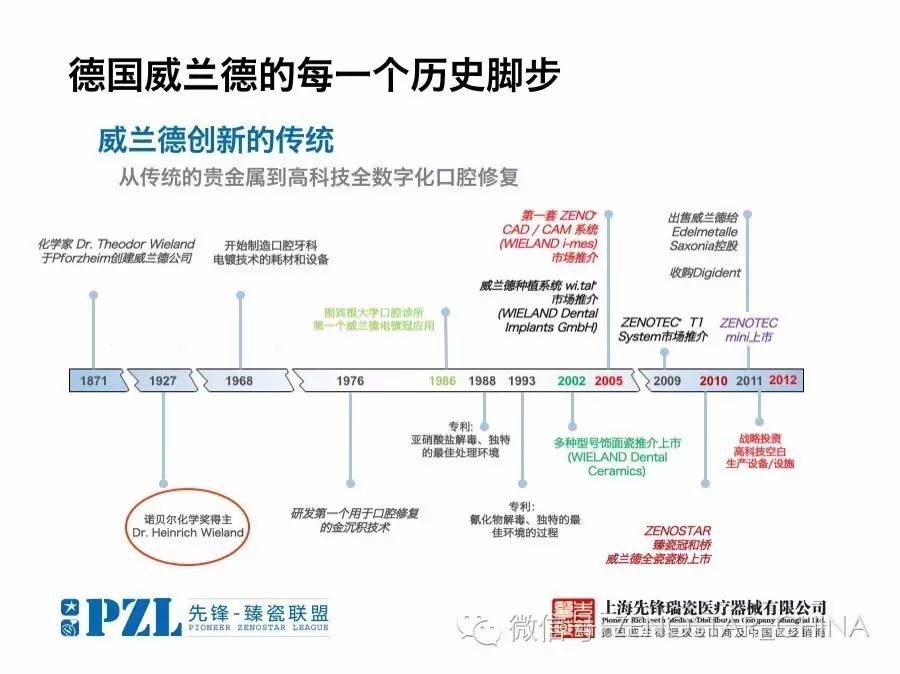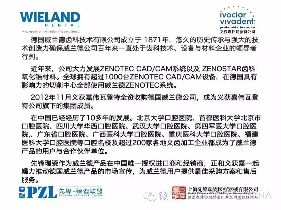 透過德國威蘭德一百多年的發(fā)展歷史,從諾貝爾化學(xué)獎到口腔金沉積技術(shù)的研發(fā)和應(yīng)用,德國威蘭德的每一步始終走在了口腔技工行業(yè)的最前端。擁有最先進(jìn)的氧化鋯生產(chǎn)工藝及氧化鋯圓盤的行業(yè)專利標(biāo)準(zhǔn)和獨有的染色工藝,使德國威蘭德必定成為口腔義齒加工技術(shù)的主導(dǎo)者和締造者。